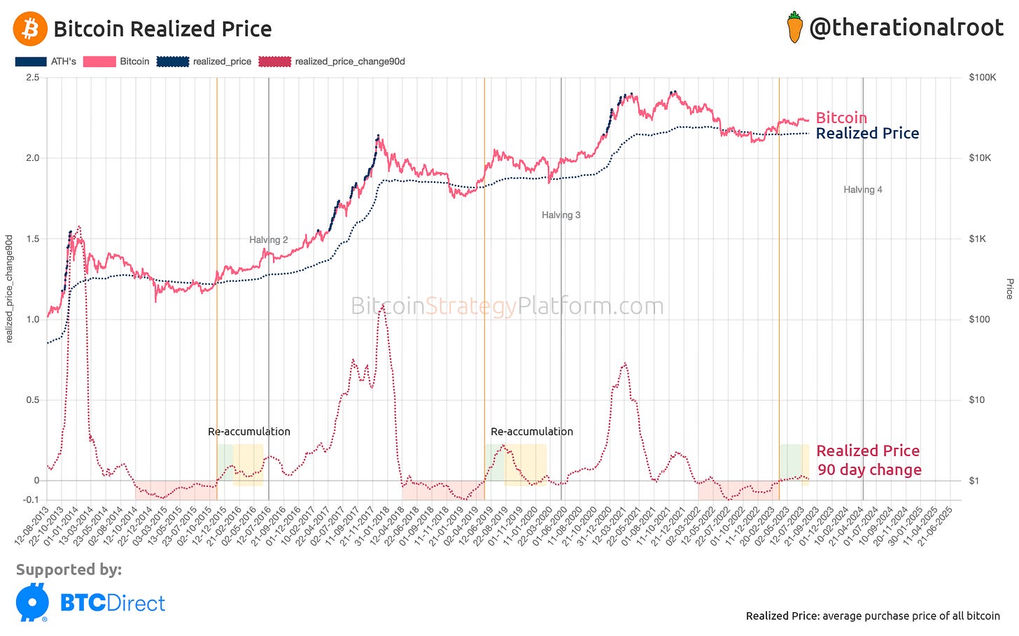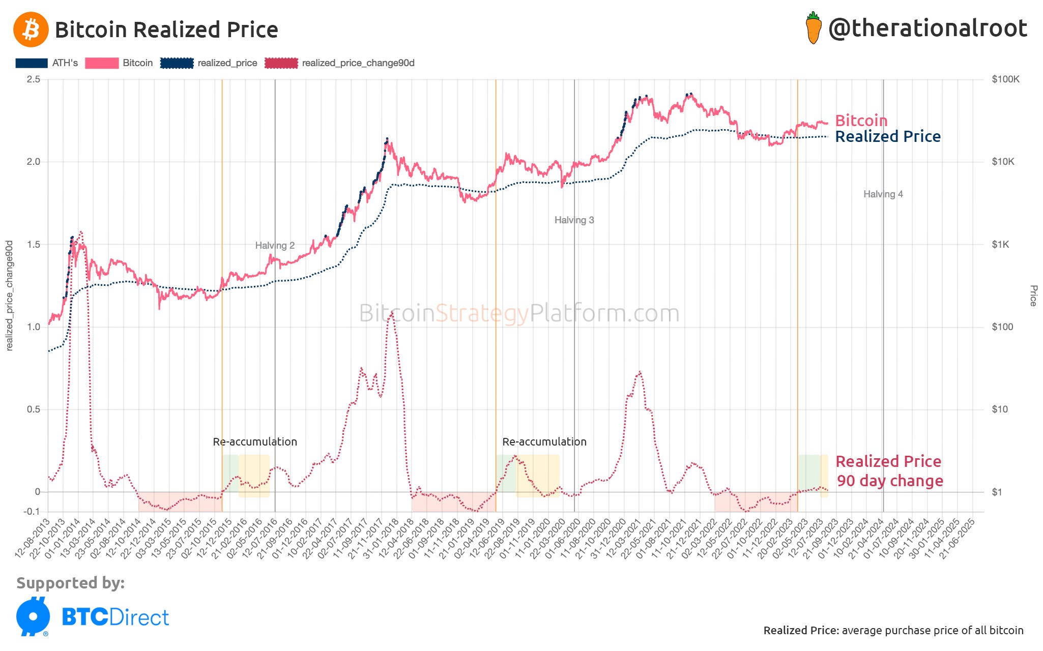 However, during each cycle, we had a pretty strong start off the cycle bottom (green zone in below chart). Following such an impressive start, which led to a twofold increase in price during this cycle, surging from $15,000 to $30,000, the market needs time and enters a re-accumulation phase (yellow zone) before being able to continue further upward momentum. A re-accumulation phase primarily causes side-ways price action.