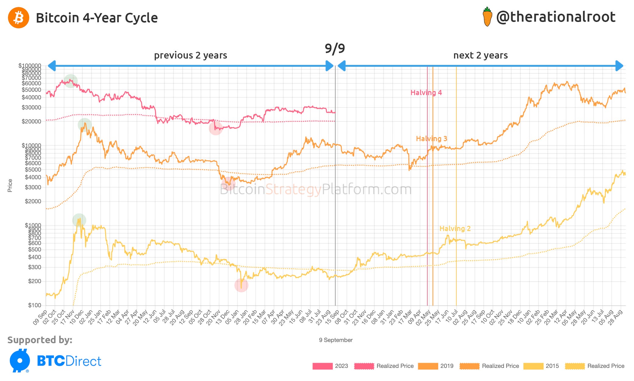 We've charted the 4-year cycle, using today's date as a reference and comparing it with the same day in previous cycles. The vertical gray line represents today, with two years visualized on either side.