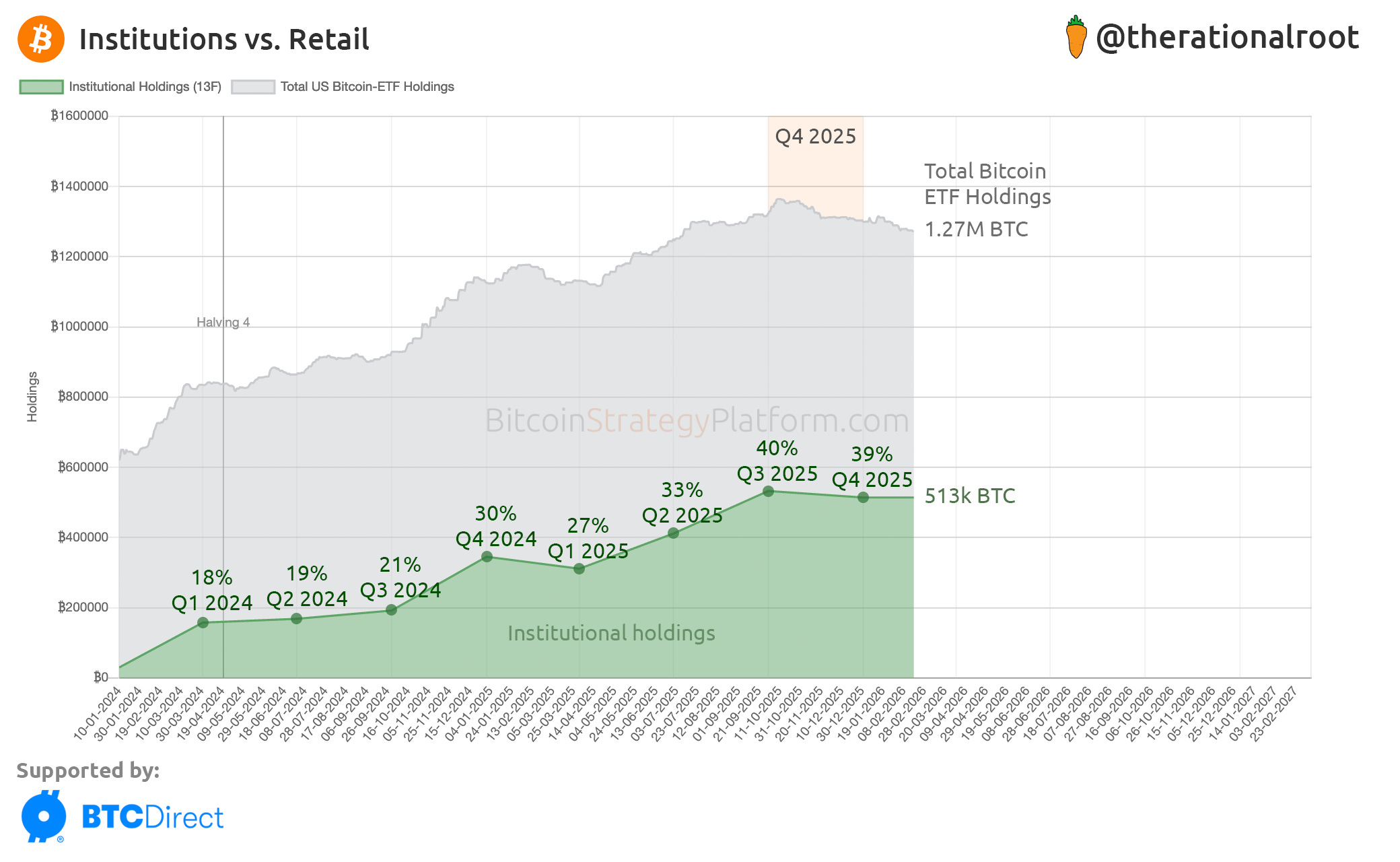 After a drop from 532k BTC in Q3, institutions still hold over 513k BTC through ETFs. With a decrease of 19k BTC, this is the second-largest drop after Q1 2025.
