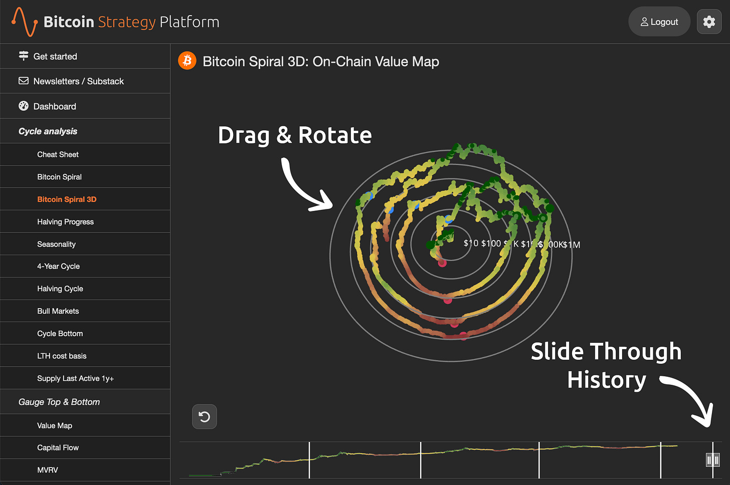I’m excited to announce the addition of the 3D Spiral Chart to the Bitcoin Strategy Platform. This is one of our most powerful tools, providing a unique perspective on Bitcoin’s cycle and sentiment phases, now available for all paid subscribers!