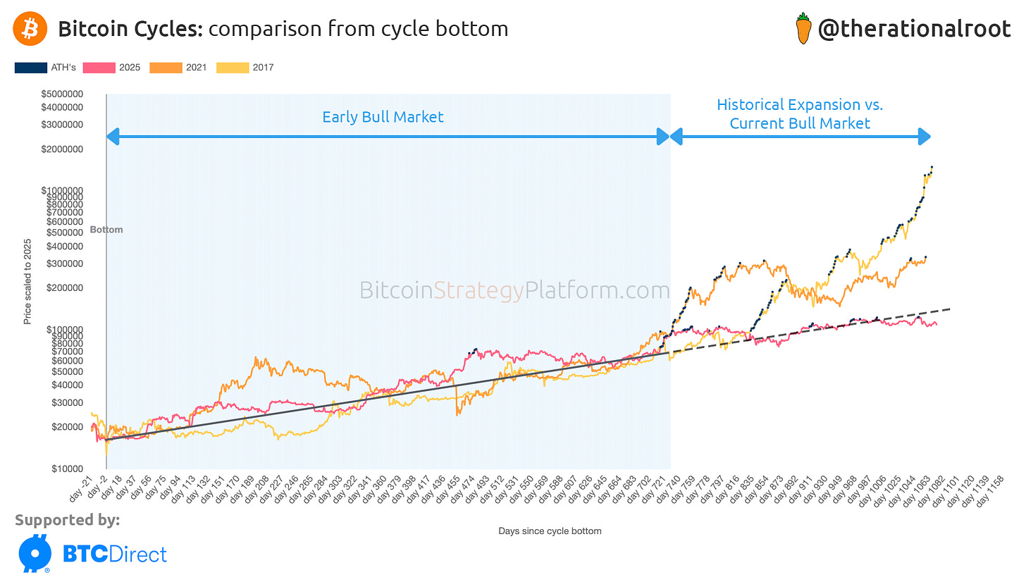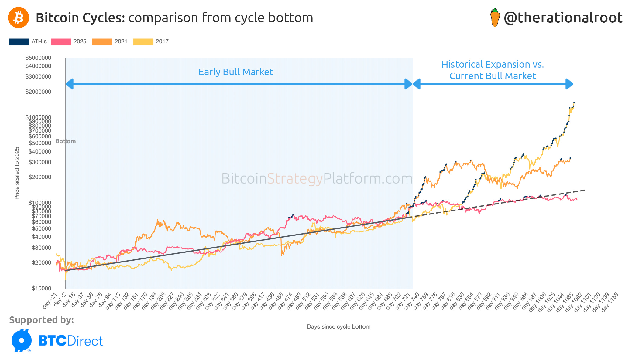 Cycles measured from the halving: we’re currently around 39% (measured in blocks), where all previous cycles had already peaked. However, when measured in days, the previous cycle had not yet peaked.